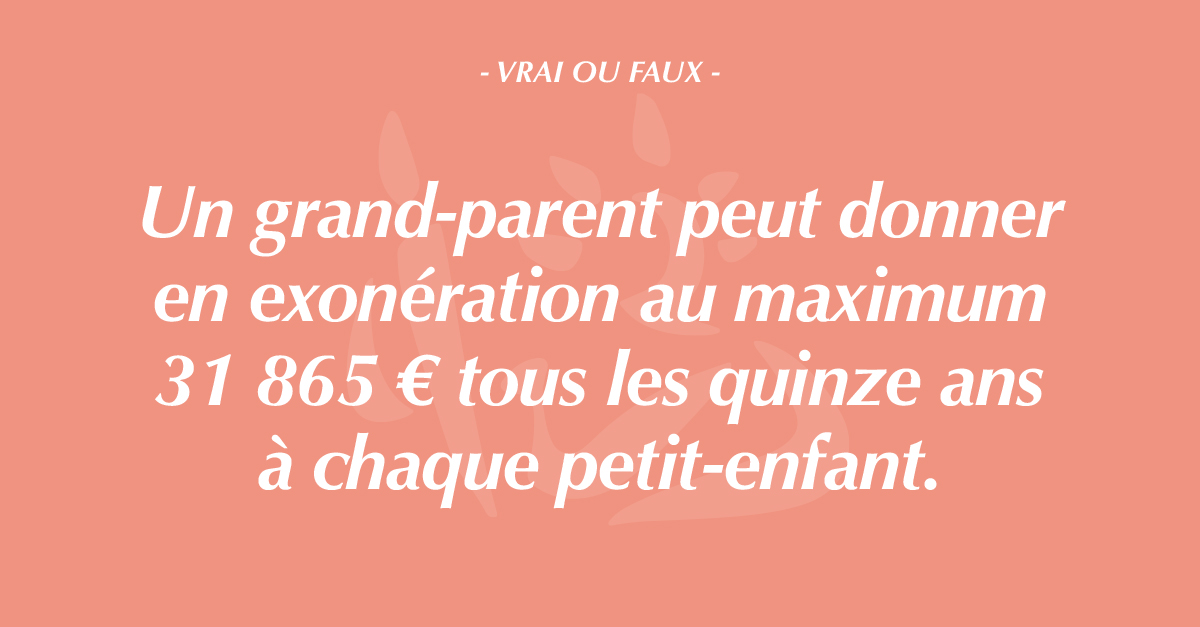 VRAI & FAUX. Il existe un abattement de droit commun de 31 865 € en matière de donation consentie par un grand-parent à un petit-enfant, et ce, quelle que soit la nature du bien transmis. De plus, il existe une exonération spécifique de 31 865 € pour les dons de sommes d’argent, sous réserve de remplir certaines conditions. Le grand-parent doit être âgé de moins de 80 ans et le petit-enfant majeur au jour de la transmission. La déclaration auprès de l’administration fiscale doit intervenir dans le mois suivant le don. Ces régimes sont renouvelables tous les quinze ans. Depuis le 1er janvier 2026, les dons manuels et de sommes d’argent doivent obligatoirement être déclarés en ligne (sauf si le petit-enfant est mineur, le grand-parent donateur n’étant pas son représentant légal).
